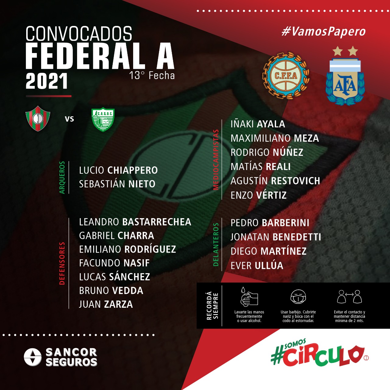 Con la novedad de la inclusión del último refuerzo Leandro Basterrechea por primera vez entre los convocados y el regreso de Diego Martínez luego de una lesión muscular, Gustavo Noto dio a conocer la lista de 19 futbolistas para recibir el domingo a las 15 a Camioneros por la 13ra fecha de la Zona 1 del Torneo Federal A.